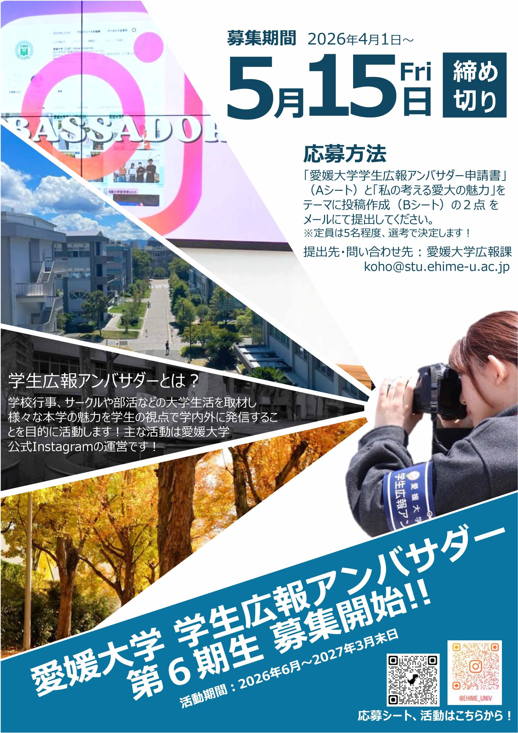◆学生広報アンバサダーへの取材依頼は、愛媛大学広報課(koho@stu.ehime-u.ac.jp)までご連絡ください。