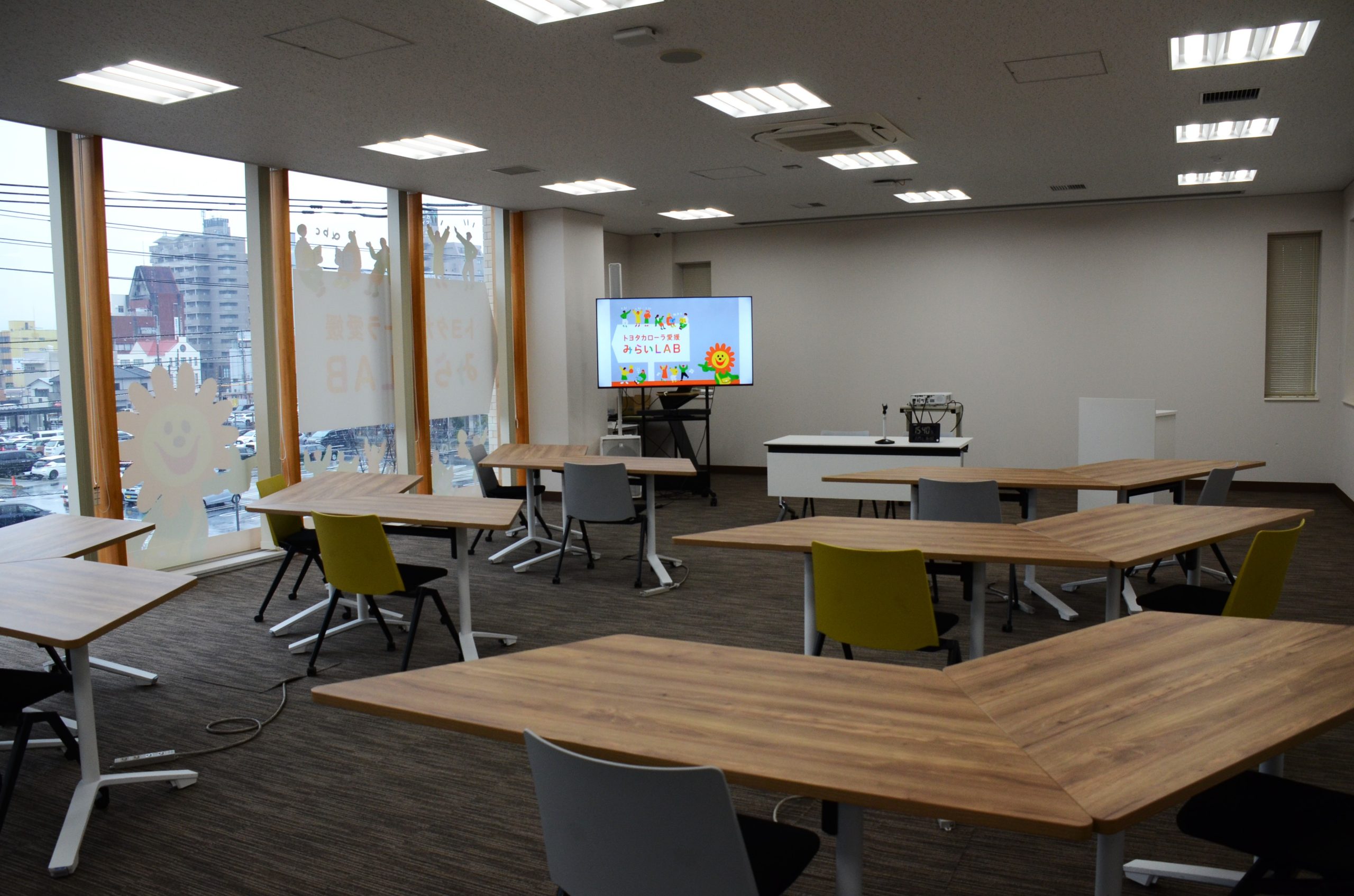 | 3階 トヨタカローラ愛媛みらいLAB (地域サステナビリティスペース) | 音響設備(ポータブルスピーカー1台、ワイヤレスマイク8本) プロジェクター 1台 スクリーン1枚(北側の壁に直接投影することも可能) 演台 1台 司会台 1台 3面折り畳み式ホワイトボード 6枚 |