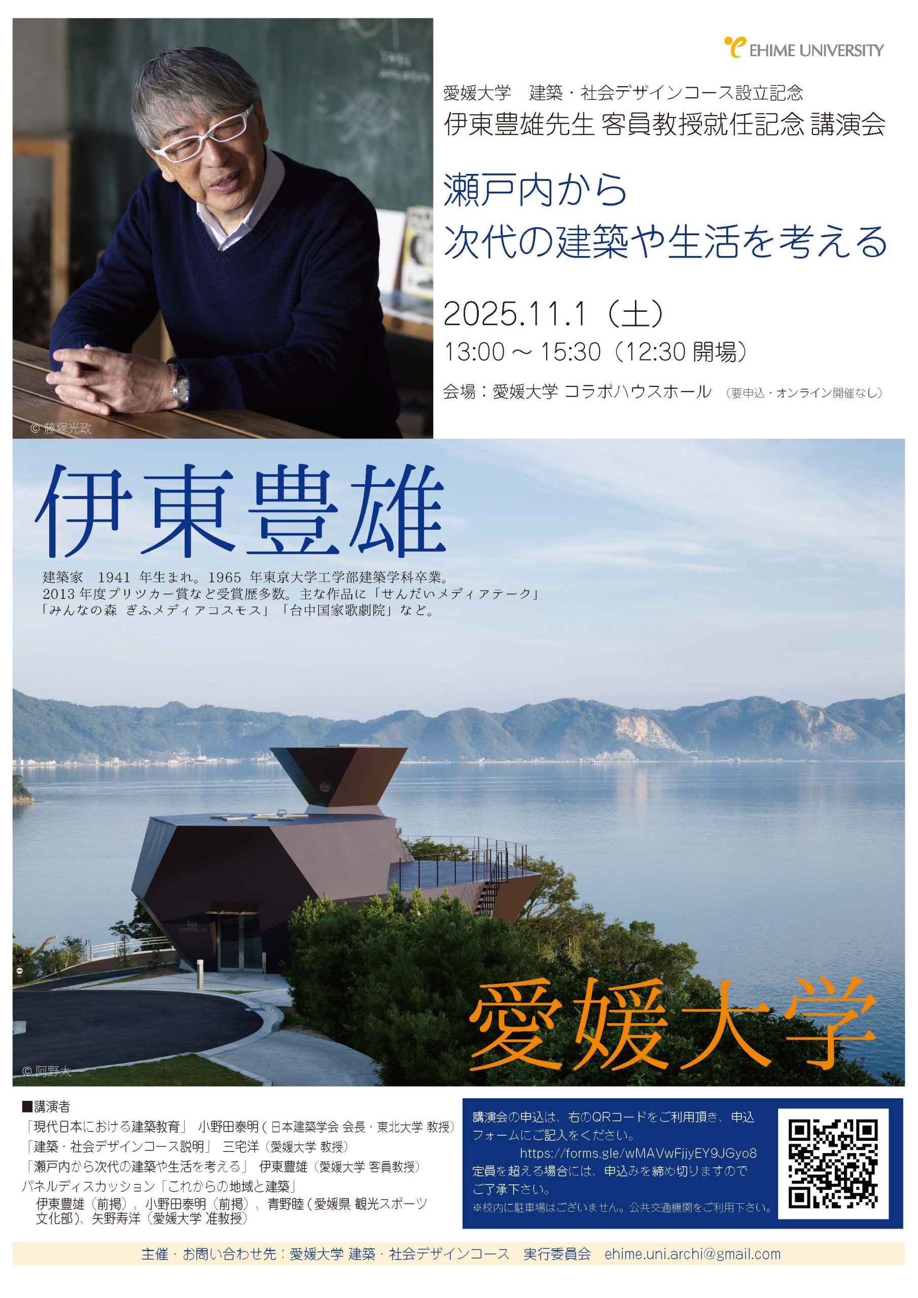 【参加者募集】愛媛⼤学建築・社会デザインコース設⽴記念 伊東豊雄氏客員教授就任記念講演会