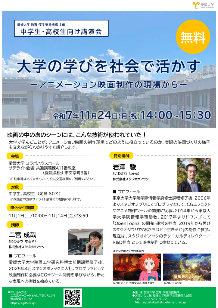 スタジオジブリの系譜を受け継ぐ映画制作会社スタジオポノック(『メアリと魔女の花』『屋根裏のラジャー』などを制作)で活躍するスタッフをお迎えし、映画づくりの現場について楽しくお話しいただきます。大学での学びが、アニメーション映画の制作の中でどのように役立っているのかを、実際の作品づくりのエピソードを交えながらわかりやすく、ご紹介いただきます。