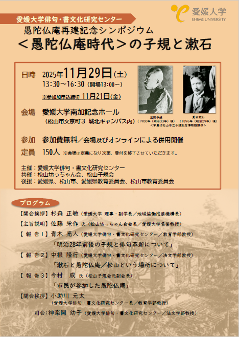 愛媛大学地域協働推進機構俳句・書文化研究センターでは、地域の研究団体である松山坊っちゃん会と松山子規会の協力を得て、愚陀仏庵再建記念シンポジウムを開催します。