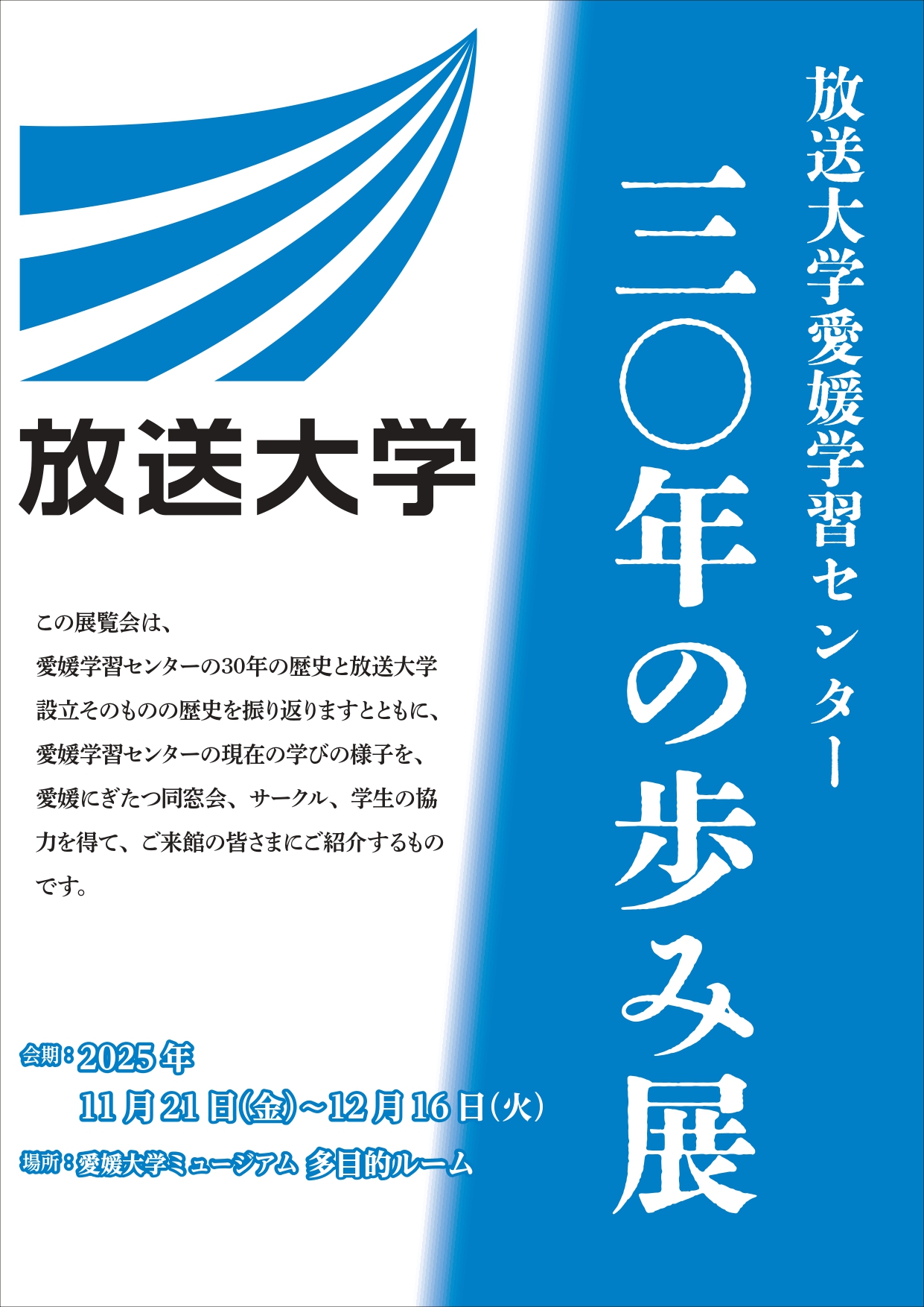 愛媛大学ミュージアムでは、放送大学愛媛学習センター30年の歩み展を開催します。