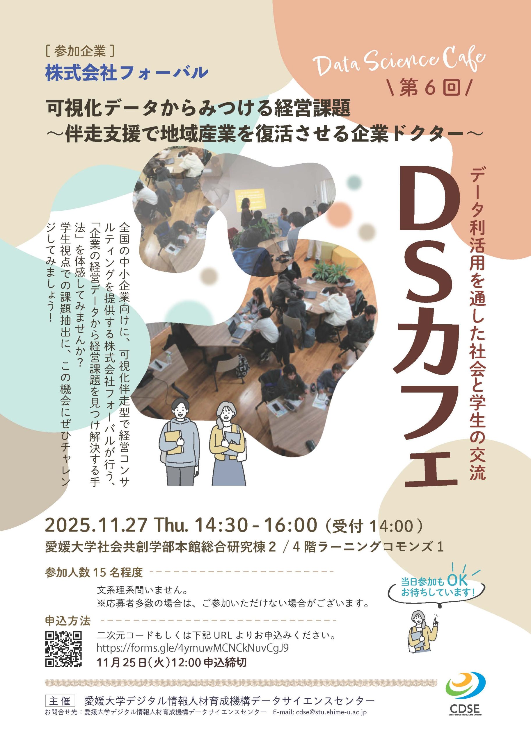 「データ利活用を通した社会と学生の交流」を目的とした愛媛大学デジタル情報人材育成機構データサイエンスセンター主催のイベント『DSカフェ』を開催します。