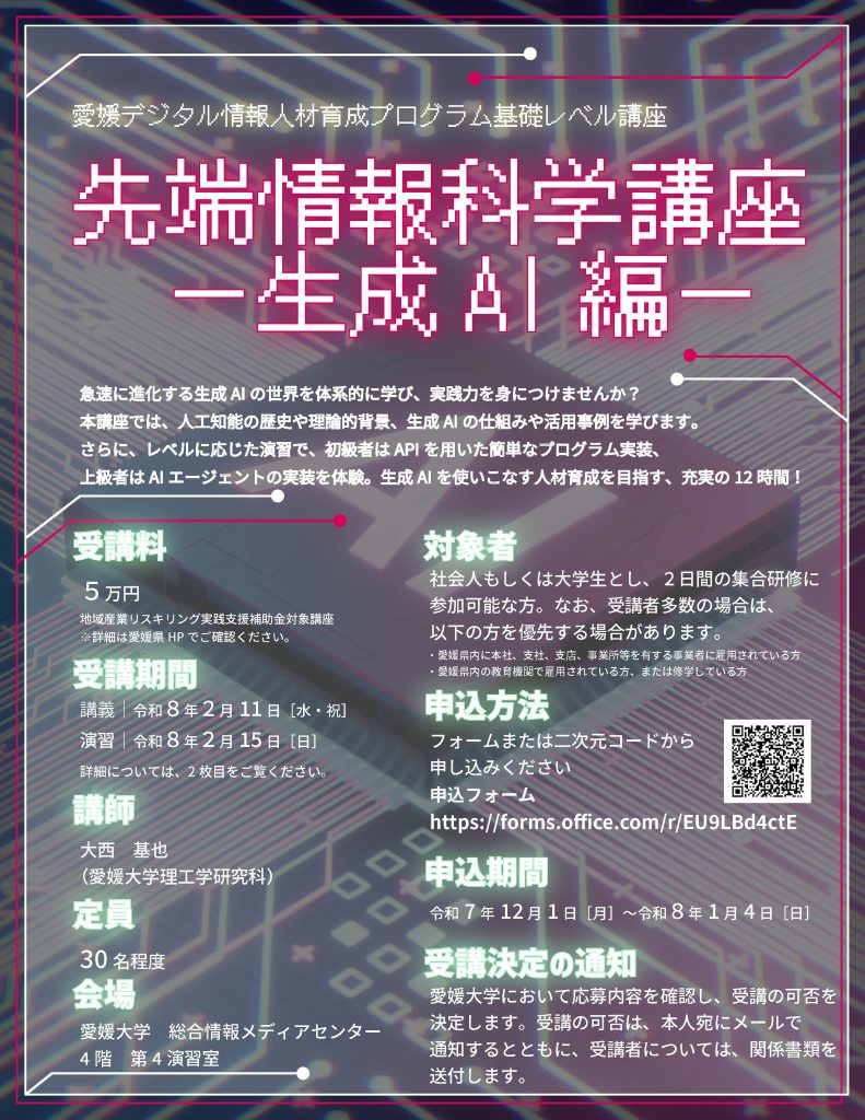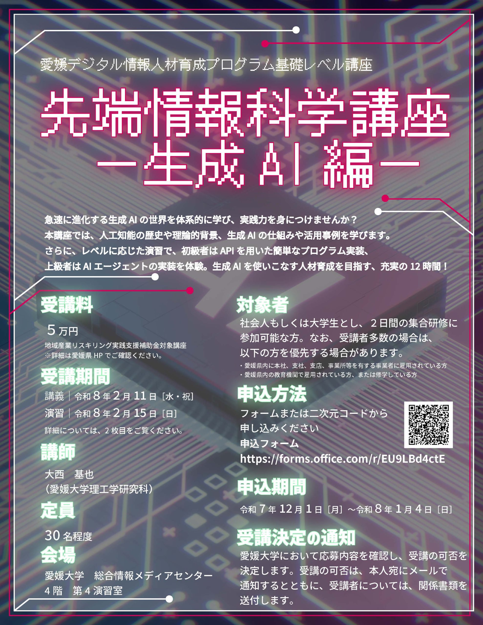 愛媛大学デジタル情報人材育成機構では、令和6年度から社会人向けリスキリング講座を開始しています。今回は、愛媛デジタル情報人材育成プログラムの基礎レベル「先端情報科学講座 ―生成AI編―」の受講者の募集を開始しましたのでお知らせします。