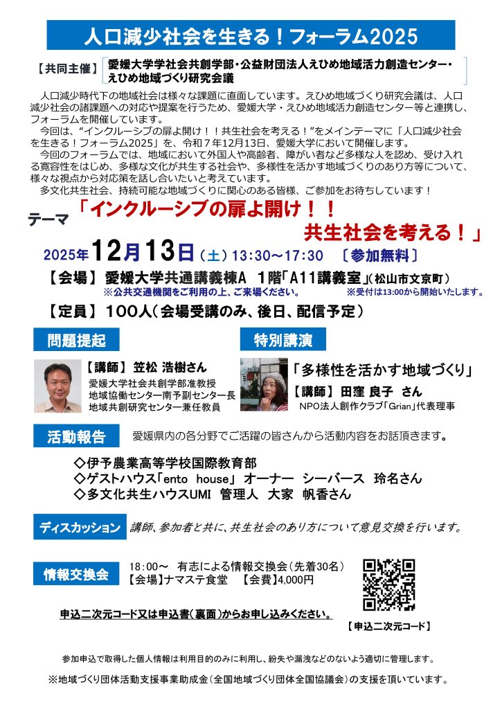 愛媛大学社会共創学部、えひめ地域づくり研究会議、公益財団法人えひめ地域活力創造センターは、「人口減少社会を生きる!フォーラム2025」を共同開催します。