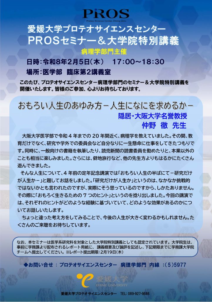 愛媛大学先端研究院プロテオサイエンスセンターでは、病理学部門主催の「PROSセミナー」を開催します。