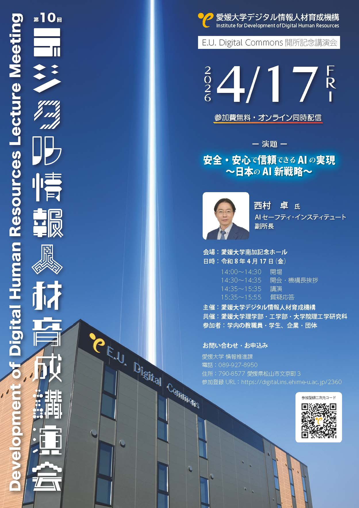 愛媛大学デジタル情報人材育成機構では、令和6年10月から社会人向けリスキリング講座を開始するとともに、デジタル情報人材育成に資する様々な取組を行っており、その一環として、デジタル情報人材育成に関する多様なテーマを対象に、「デジタル情報人材育成講演会」を開催しています。
