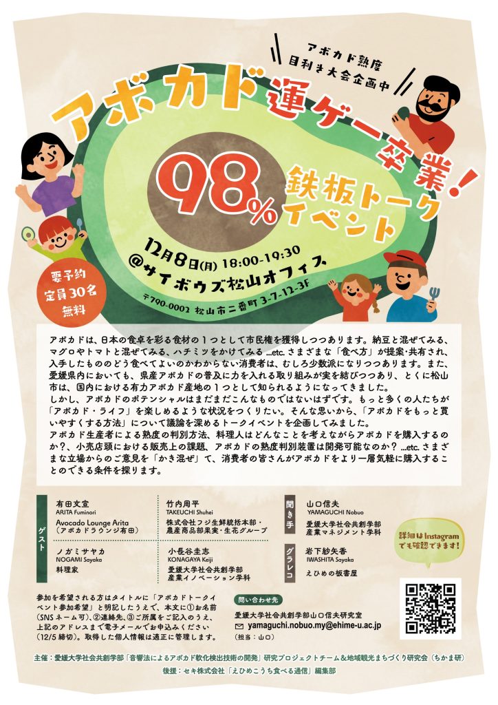 タイトルに「アボカドトークイベント参加希望」と明記して、①お名前、②連絡先、③所属をご記入の上、yamaguchi.nobuo.my@ehime-u.ac.jp(山口信夫准教授メールアドレス)に12月5日(金)までにお申し込みください。