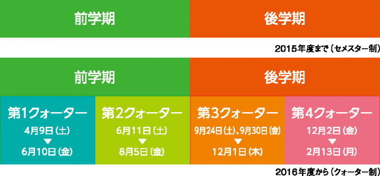 平成28年度から愛媛大学が大きく変わり、新学部創設はもちろん、在校生にとって学業に深く関わるのが「クォーター制」。従来のセメスター制(前期・後期)も残しつつ、4学期制が新しく取り入れられました。週一回だった授業が週二回になり、短期間で単位が取得できる利点があります。一方で、正門付近にある「法文学部講義棟」の名称が「共通講義棟B」となり、建物の名称が変更したため、教室の確認が必要です。また、平成27年度以降の入学生はGPA制度※1にも違いがあり、履修した捨て科目※2を期間内に取り消さなければ、GPAが下がることにつながるのでご注意を。