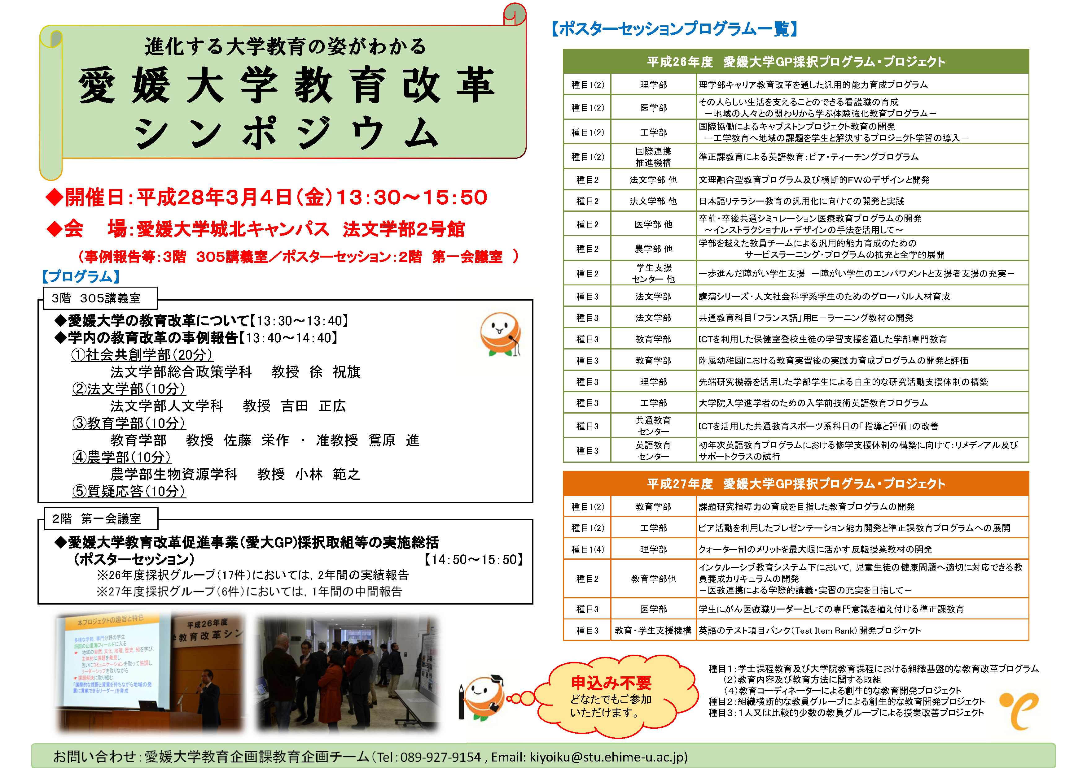 愛媛大学では、このたび、平成27年度愛媛大学教育改革シンポジウムを下記のとおり開催します。