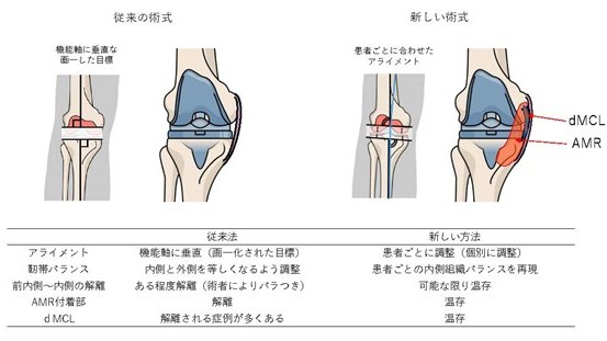 - 人工膝関節全置換術において、一般的に広く行われている内側軟部組織解離による調整を行わず、患者個々のアライメントを加味し、1mm・1°単位の追加骨切り調整により患者個々の生来の内側軟部組織バランスを獲得する新たな術式を開発