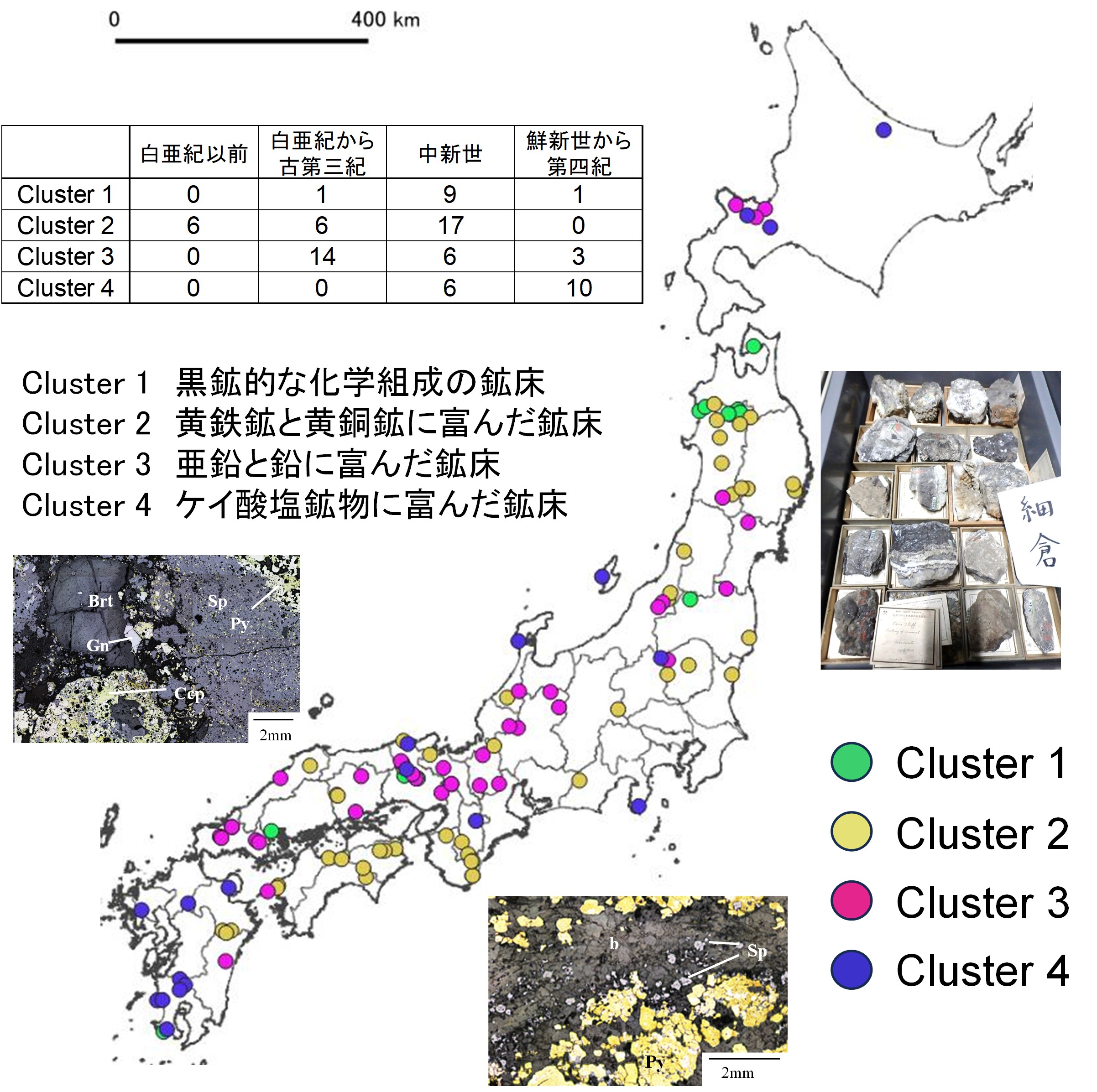 - 4つのクラスターの特徴は鉱床タイプとは異なり、化学組成の観点からの新たな鉱床分類が可能になった。化学組成の支配因子は各鉱床形成年代での地殻変動、広域応力場、マグマ活動、海底火山活動であると解釈できた。