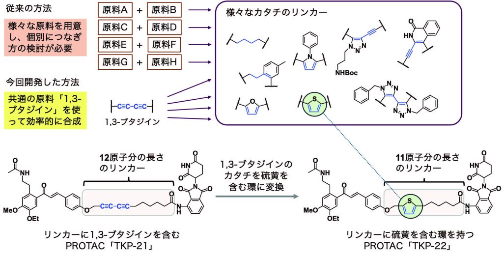 - 「1,3-ブタジイン」という構造をリンカーに活用することで、完成したPROTACsを土台に、多様なTKP-5類似分子を効率よく合成できる新たな手法を確立しました。