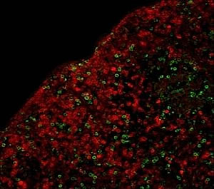 図3 マウスの体内でヒトのリンパ球(緑色と赤色に染色された細胞)が分化増殖する。