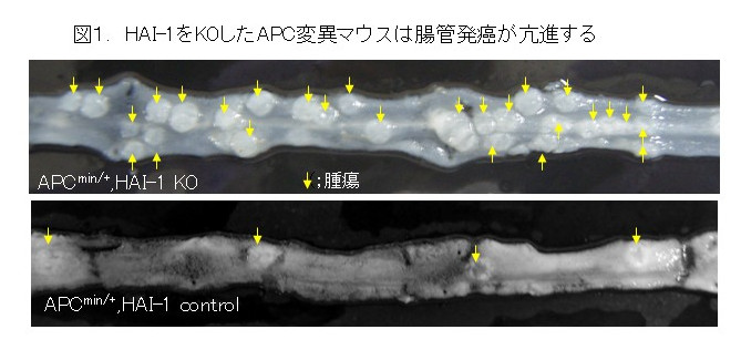細胞膜上のセリンプロテアーゼインヒビターは、Hepatocyte growth factor activator inhibitor (HAI)-1とHAI-2の2種類が同定されています。これまでの研究で、HAI-1は表皮や腸上皮組織の機能維持に必須であることやHAI-1減少によるプロテアーゼ活性制御破綻が上皮の様々な疾患につながることを報告してきました。例えば、HAI-1を欠損させたAPC変異マウス(APC 遺伝子に変異があるヒト大腸癌モデルマウス)では、発癌が著明に亢進していました(図1)。