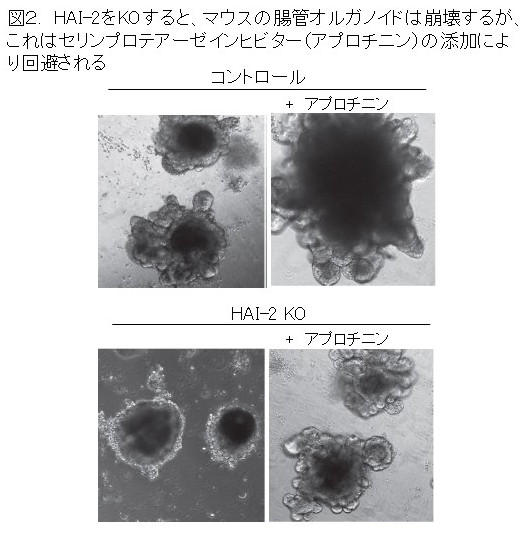 一方、HAI-2の機能については、まだ不明な点が多いのですが、近年、HAI-2をコードするSPINT2 遺伝子変異がヒトの先天性ナトリウム下痢症の原因となることが報告されました。また、マウスでHAI-2を欠損させると、この疾患と類似する表現型を呈し、早期に致死となることが明らかになりました。HAI-2欠損マウスから腸のオルガノイド(ミニ臓器)培養を行い、解析したところ、HAI-2欠損によって上皮接着因子であるEpCAMの切断とclaudin-7の不安定化・消失が生じ、オルガノイドは崩壊しました。これはセリンプロテアーゼインヒビターであるアプロチニンの添加により回避されました(図2)。