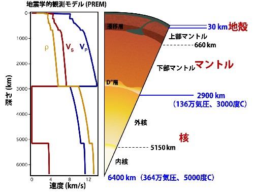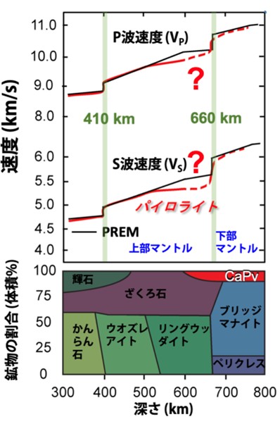 地震が発生すると、地下の振動によって音響エネルギーを伴う弾性波が発生します。これは地震波(seismic waves)と呼ばれ、地球内部を伝播していきますが、その伝播速度は、地下を構成する岩石の密度と弾性(図1)に関係します。科学者たちは、既知の鉱物組成を持つ岩石を合成し、その岩石を伝播する弾性波の速度を実験室で測定することで、この現象を再現しています。実験室で測定された弾性波の速度と、PREM(Preliminary Reference Earth Model, 図1)のような地球全体の一次元モデルによる地震波速度を比較することで、どのような岩石が地球深部に存在するかを直接的に推定することができます。この手法は、私たち自身が到達不可能な深部地球の組成と構造を推定するために用いられます。何十年もの間、科学者たちはこの技術を用いて地表から深い下部マントルや核に至るまでの地球内部を調査してきました。その結果、パイロライト(pyrolite, 図2)と呼ばれる仮想的な岩石(約60%のカンラン石と40%の輝石・ガーネットから構成される)の弾性波速度が、深さ約560 kmまでの観測値とよく一致することが示されました(図2)。しかし、これより深い領域、特に下部マントル(図1、2)については、現在の鉱物学的モデルでは地震波観測で求められる弾性波速度を完全に説明できておらず、確固たる結論は得られていません。地球深部のこの理解不足は、主に下部マントルの高い圧力と高い温度条件で実験室での測定を実施することが技術的に非常に困難であることに起因しています。