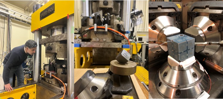 図3:(左)高圧実験に使用した、ビームラインBL04B1に設置されているマルチアンビル高圧発生装置SPEED1500。(中)裏側に超音波測定用の装置が取り付けられたタングステンカーバイド(超硬合金)アンビル。(右)実験前のセルアセンブリを組み込んだ高圧装置の内部。
