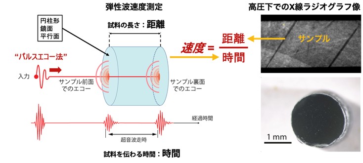 過去10年間で、私たちは兵庫県にある世界最大の放射光施設の一つであるSPring-8のビームラインBL04B1において、高圧セル実験試料、超音波干渉法及びX線イメージングシステムを開発しました(図3)。特に、岡山大学で開発されたテーパータングステンカーバイド(超硬合金)アンビルを二次的な加圧ステージとして使用することで、地下深さ約800 kmの下部マントルに相当する30 GPa(30万気圧)を超える高圧を達成できるようになりました。試料は、コバルトが微量添加された酸化マグネシウム製の媒体に入れられ、円筒形レニウム(Re)ヒーターが装備されています。これにより、高圧下で2000 ºCまでの高温を発生させることが可能です。また、加熱中の内部圧力の低下や弾性波信号の減衰を防ぐため、アンビルを冷却するシステムも確立しました。この放射光施設の高エネルギーX線ビームは、(1) エネルギー分散型X線回折によって、高圧下における鉱物の結晶構造を分析、(2) X線ラジオグラフィイメージング(図4)によって、試料の長さの決定、の2つの目的に使用されます。特に、大型高圧発生装置の直後に配置された高解像度CMOSカメラを用いたラジオグラフィ撮像は、ミリメートル以下のサイズの試料の長さを高精度で測定することを可能にしました。超音波エコーの記録には、新しく導入された低ノイズ・高周波増幅器と高速伝送(ソリッドステートリレー)システムが組み合わされています。これにより、パルス・エコー重畳法(図4)を用いて、P波(縦波)は60 MHz、S波(横波)は40 MHzの共振周波数で、伝播時間を正確に測定できるようになりました。これらの改善された技術により、私たちは現在、深さ約560 kmよりも深い領域の高圧高温条件において、あらゆる物質の弾性波速度を測定することが可能になっています。
