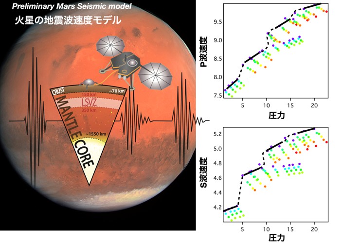 地球深部の謎に挑む:超高圧下での弾性波速度測定と新たなフロンティアである新しい超音波測定システムと高速データ取得装置を放射光施設のビームラインに導入したことにより、私たちは2019年に、地球の下部マントル最上部に相当する圧力・温度条件下で、下部マントルの主要鉱物であるCaSiO3ペロブスカイト(デイブマオアイトとも呼ばれる)の音速測定に世界で初めて成功しました。この成果に続き、私たちは他の重要鉱物の弾性波速度も調査し報告してきました。これらの知見は、地球マントルの全体的な化学組成に関する理解を深めるとともに、沈み込むスラブ(プレート)の地震学的構造の解明を進めました。現在、私たちは下部マントルの他の2つの主要鉱物、ブリッジマナイト(MgSiO3)とフェロペリクレース(Mg,FeO)の弾性波速度測定に取り組んでいます。これらの実験で期待できる成果を達成すると想定していますが、このような超高圧・超高温の条件下で行われた実験データの蓄積数はまだ限られています。そのため、地球の下部マントルに残された最後の秘密、つまり、下部マントルはどのような鉱物で構成されているかを解き明かすには、さらなる時間が必要です。また、これらの実験技術、特に数十万気圧・数千度に及ぶ超高圧・超高温の極限環境条件下における弾性波速度測定は、、地球の鉱物研究に限定されるものではありません。例えば、私たちはこの技術を、地球マントル内の部分溶融領域の調査や、近年の探査での地震データによって低速度域の存在が示唆され、将来の探査ミッションが計画されている月や火星の内部構造の解明にも応用しています(図5)。これは、国際的な惑星科学コミュニティから近年非常に強く求められている研究トピックです。さらに、私たちは地球科学をとびだし、研究対象を多成分からなる岩石集合体や、硬質セラミックス、ガラス、軟質材料など、材料科学や物性物理学の対象となる非常に幅広い物質にまで広げました。これにより、様々な研究分野の国内外の機関との協力関係を深めることにも成功しています。