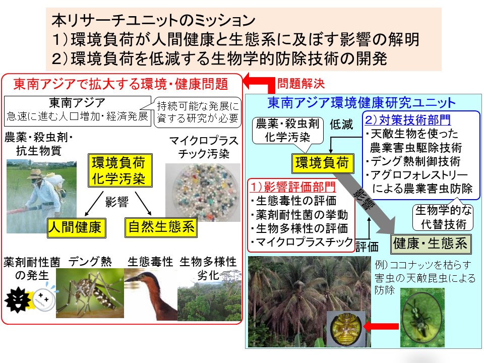 In Southeast Asia, where economic development is rapidly advancing, excessive use of pesticides and chemical pollution such as insecticides used for infectious disease-carrying mosquitoes is widespread. This RU will bring together research groups within the university whose keywords are “Southeast Asia,” “environment,” and “health” to form an international research center that will contribute to solving environmental and health problems in Southeast Asia. This RU consists of 1) Impact Assessment Division and 2) Countermeasure Technology Division. These two divisions are in charge of 1) impact assessment of environmental impacts on human health and natural ecosystems, and 2) development of biological control technologies to mitigate these environmental impacts.