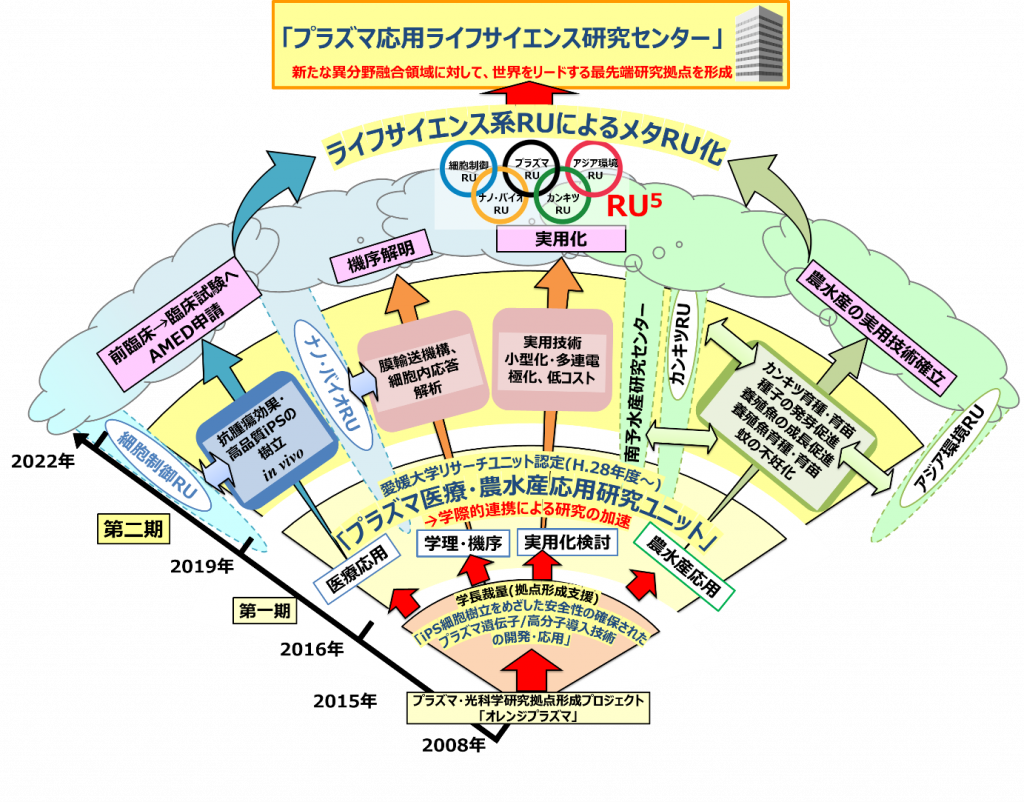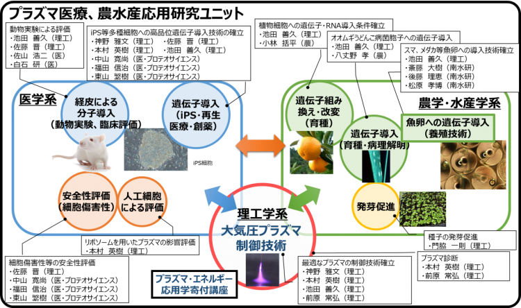 This Research Unit is an extension of the results of the “Development and Application of Plasma Gene/Polymer Introduction Technology,” which was adopted as a Center Formation Support Research Activation Project of Ehime University from 2013 to 2015, with the addition of new collaborations with the Faculty of Agriculture and the Nanyo Fisheries Research Center.