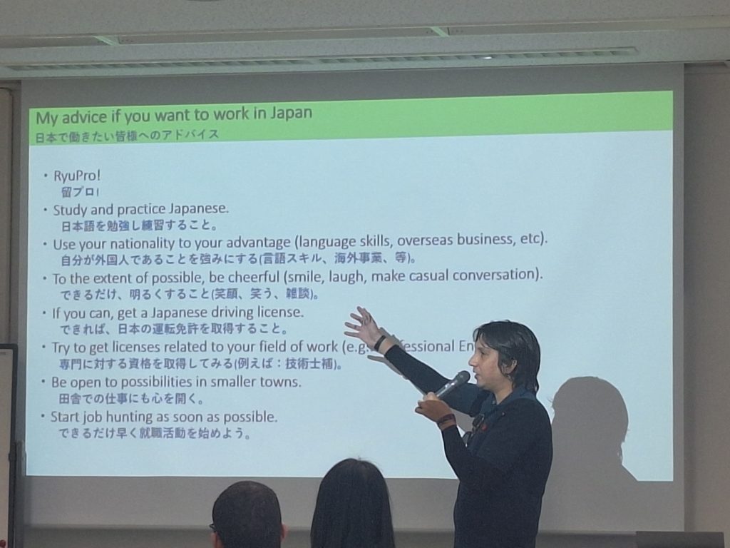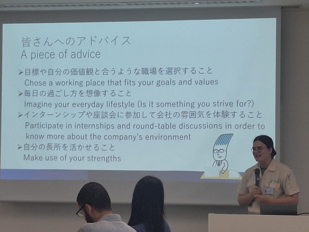 Students who participated in the seminar commented, “It was very informative to interact with graduates working in Japan and hear about their experiences in job hunting and work,” and “I realized that the essence of job hunting is to accept the harsh reality that Japanese is a must in order to find a job at a Japanese company, and to make a wise decision based on the company’s recruitment information while assessing the priority of language skills and specialized skills. I realized that the essence of job hunting is to make a wise decision based on the company’s employment information, while accepting the harsh reality that Japanese is required to find a job at a Japanese company and determining the priority of language skills and specialized skills.