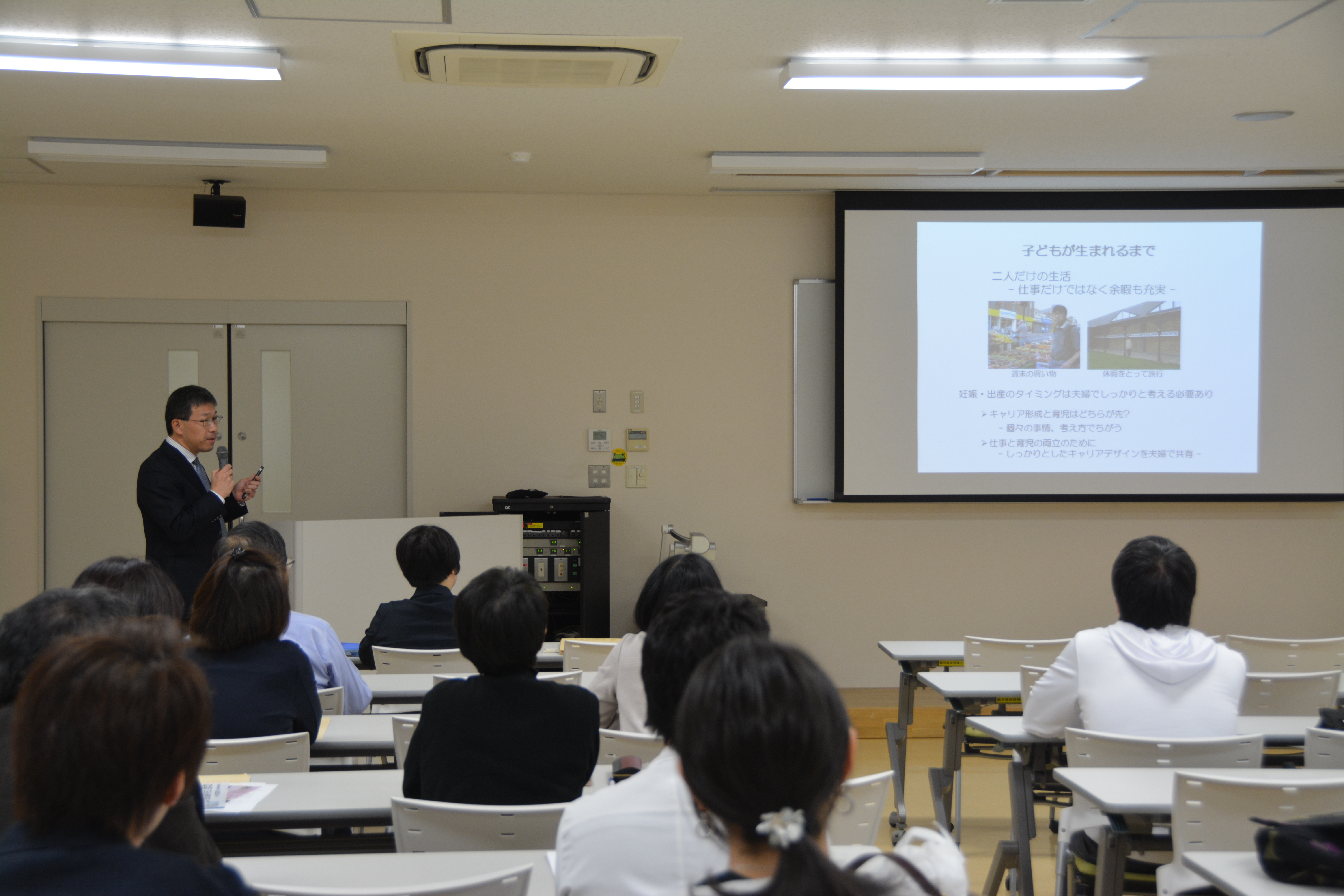 今回の懇談会では、「男女共同参画-男性医師の立場から」をテーマとし、愛媛県医師会長の村上博氏の挨拶に始まり、愛媛県立中央病院放射線科専攻医の河内義弘氏、愛媛県立中央病院消化器病センター長の二宮朋之氏、愛媛大学医学部附属病院周産母子センター准教授の石前峰斉氏の3人が講師となり講演を行いました。各講師は、自身の家庭での役割分担や育児体験、仕事におけるキャリア形成、育児休業制度の実態等、多岐にわたる話題を挙げながら、女性医師だけでなく、男性医師も共に働きやすい環境づくりが必要であり、そのために家庭においては家族がお互いにサポートし合うこと、職場においては同僚達の理解が重要であると話しました。