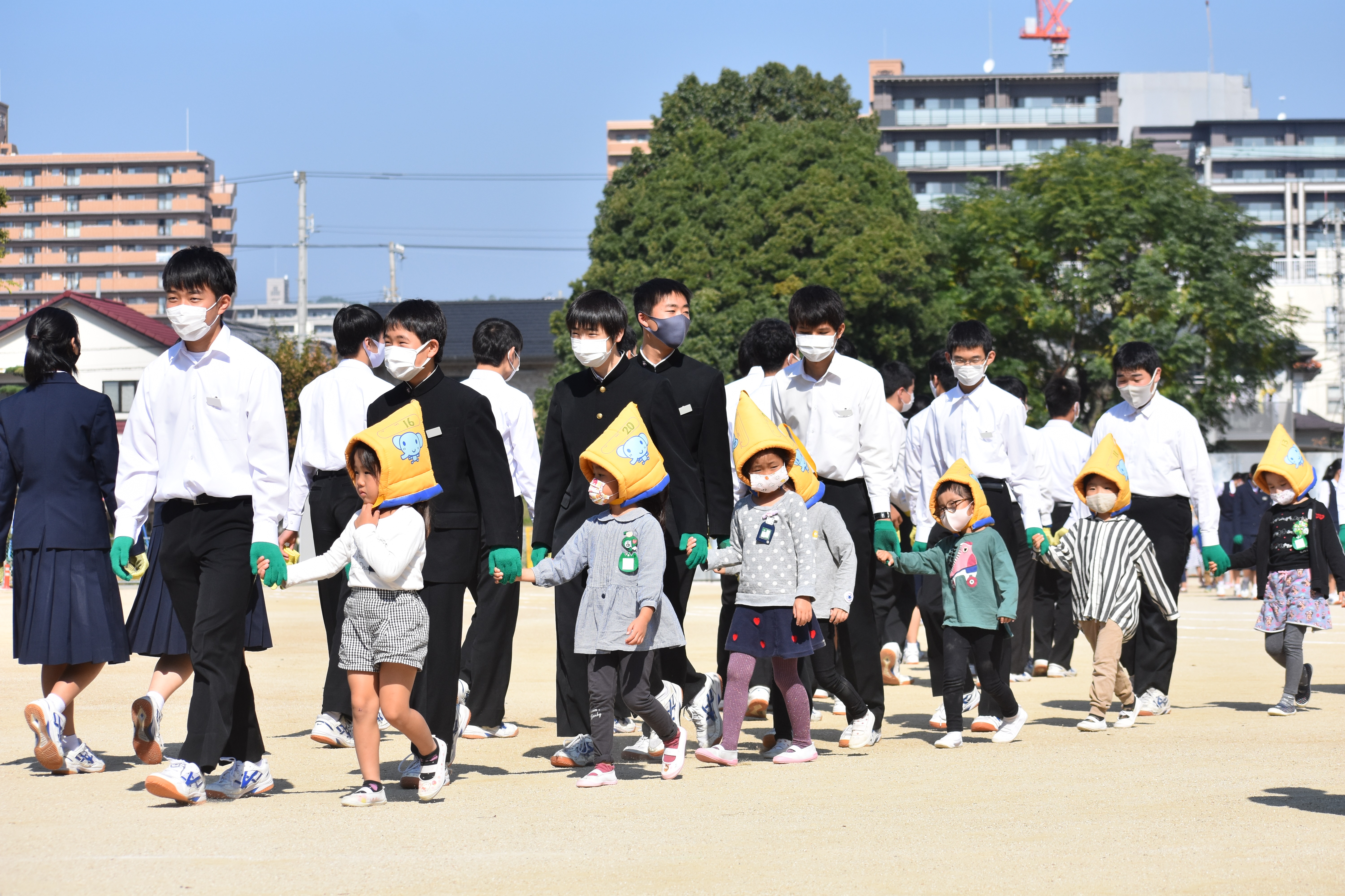 - 中学生が園児を引率・誘導する様子
