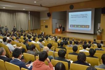 続いて、中村氏が青色LEDの特徴や発明の経緯を説明し、「若いうちの苦労が役に立った。」と厳しい環境で挑戦し続けた時代を振り返りながら、挑戦することの大切さを語りました。また、「日本人は非常にまじめでいい発明をするが、英語力のなさが原因で世界展開できていない。英語力を上げ、視野を広げるためにも、皆さんも若いうちにどんどん海外に行ってほしい」と学生に呼びかけました。