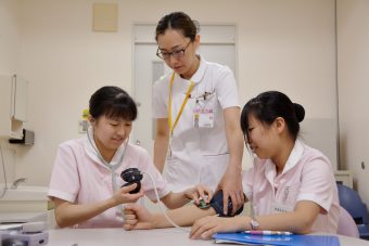 まず、生徒たちはナース服に着替え、病院内を見学しました。手術室やICU等を見学し、担当の看護師の話をメモしたり、積極的に質問をしていました。その後、各病棟に分かれ、実際に患者さんと接したり、血圧の測定や聴診器の使い方を練習しました。血圧測定を行った生徒たちは、脈を測ることや、数字を読み取ることが難しいと話していました。