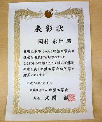 平成26年3月31日(月)、理工学研究科の岡村未対教授が、地盤工学会功労賞を受賞しました。