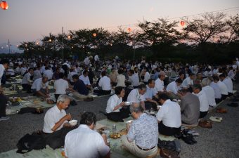 きれいな夕日と重信川からの涼しい風がそよぐ中、弓削俊洋理事の乾杯の発声で始まり、各テーブルの鍋を囲んで、いもたきを味わいながら歓談しました。席を移動しながら部局を超えて賑やかな時間を過ごすなど、今年も学内外の交流を深める時間となりました。