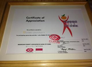 - 在インドネシア留学生協会から愛媛大学への感謝状