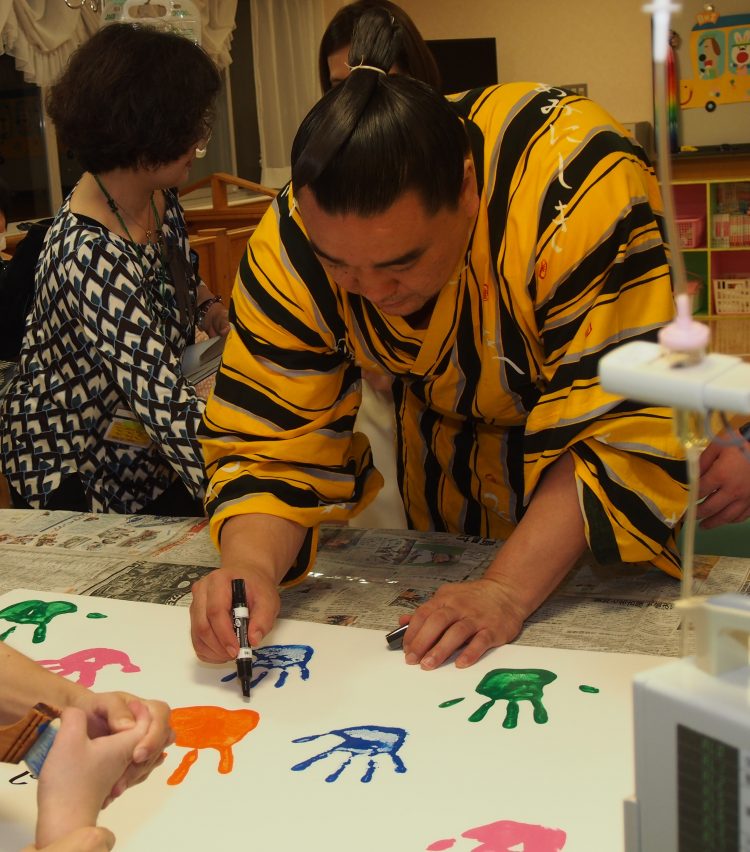 また、デイルームに手作りで用意した土俵で、四股の踏み方を説明し、子どもたちと相撲をとりました。さらに、水彩絵の具を手につけて、ボードに手形を押しました。子どもが手形を押す時には、日馬富士関がそっと手を添えて一緒に押してくれました。この手形のボードは、病気と闘っている子どもたちやご家族、また、治療に当たっているスタッフの心を癒し、勇気づけるために病棟に飾られました。