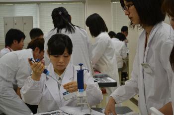 各県の教育委員会などから推薦を受けた16人の化学あるいは生物担当の高校教員(愛媛県、香川県、各3人、徳島県、高知県、各2人、静岡県、愛知県、兵庫県、岡山県、広島県、大分県、各1人)は、まず、プロテオリサーチ領域の林秀則教授から、遺伝子とタンパク質に関する講義を受けた後、理工学研究科の大学院生および理学部学生などから指導を受けながら実験に取り組みました。1日目はDNA断片を接続して組換えDNAを作製し、これを大腸菌に導入しました。2日目は本キャンプの目玉となるコムギ胚芽による無細胞タンパク質合成実験を、高校向け教材として市販されているキットを主に用いて実施しました。3日目はDNAの塩基配列をオートシーケンサーで解析したり、遺伝子組換えによって作られたタンパク質の分子量を質量分析装置で決定したり、さらに本学のe-ラーニングのサイトを利用して分子模型のグラフィックスにチャレンジしたりと、通常、高校では実施できないような実験にも取り組みました。多くの参加者にとってほとんど初めての実験もあり、器具の使い方や試薬の成分、各操作の意義などを学生補助員に熱心に質問していました。
