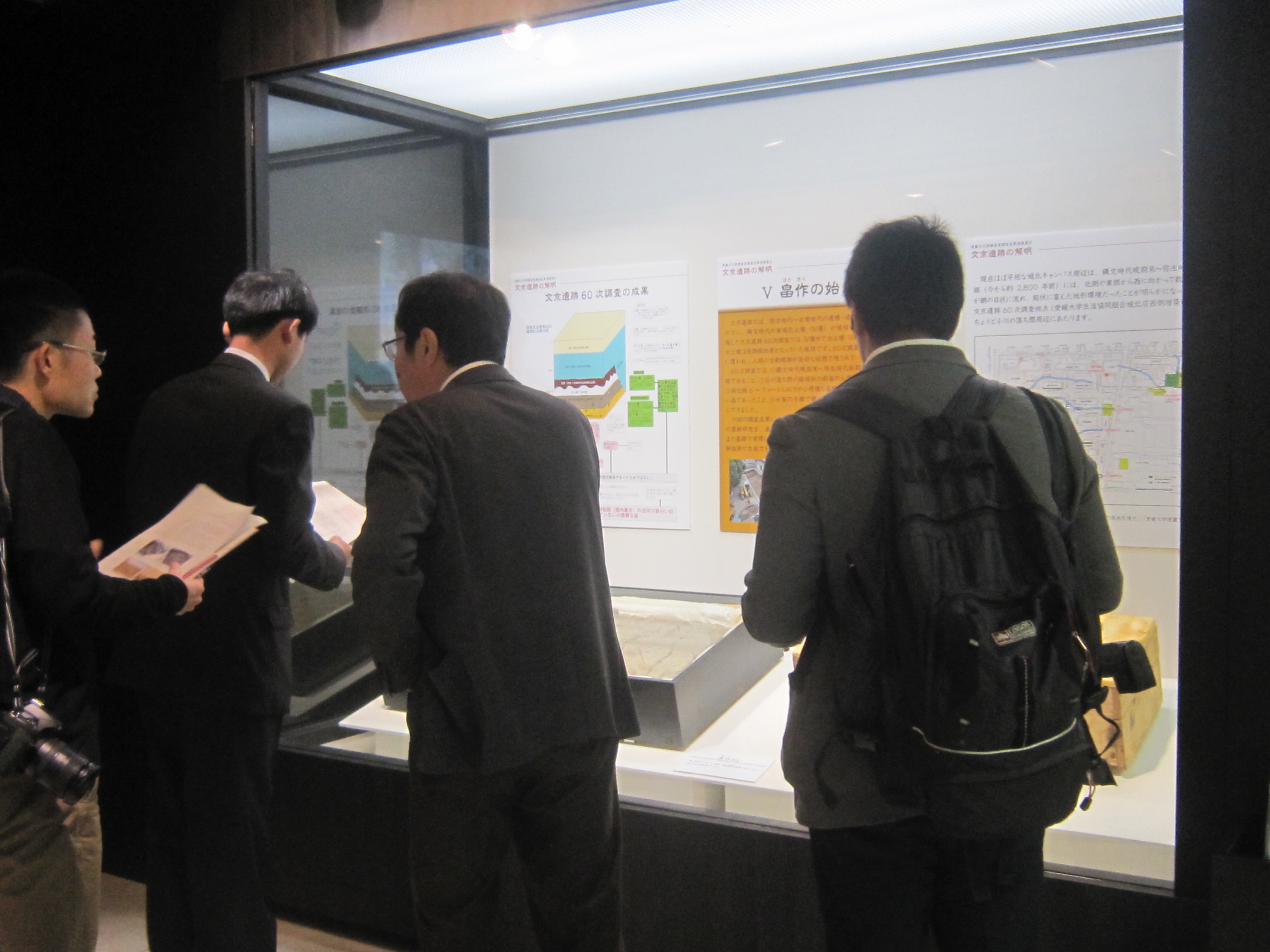 記者発表では、田﨑博之室長による概要説明の後、三吉秀充講師から詳細な説明があり、活発な質疑応答が行われました。その後、城北キャンパス大学会館横の発掘調査現場跡を見学し、続いて、本成果を成果速報展「文京遺跡の解明Ⅴ 畠作の始まり」として展示しているミュージアムへ移動し、切り取られた壁状の資料等を用いてさらに詳しい説明が行われました。