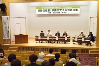 休憩をはさみ、コーディネーターに伊賀瀬道也愛媛大学医学部附属病院抗加齢センター長、助言者・司会者に谷向准教授、パネリストに大澤有次氏(畑野川歯科診療所)、浅見千代美氏(松山赤十字病院認知症看護認定看護師)、喜井茂雅氏(一般社団法人愛媛県地域密着型サービス協会副理事長)、谷岡福男氏(公益社団法人認知症の人と家族の会愛媛県支部)をお招きし、意見交換しました。