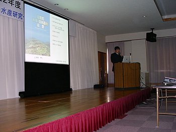 フォーラムの中で、先端研究の推進と地域との連携を念頭に置いた活動拠点として、平成20年4月に水産に関する総合的な研究施設として愛南町に設置された「愛媛大学南予水産研究センター」も3年目を迎え、地域に根ざした研究施設として、これまでの活動実績を報告しました。