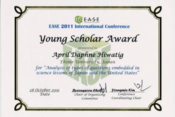 この賞は、East-Asian Association for Science Educationが、2年に1度の大会において、大学院生及び大学院修了後5年以内の研究者を対象に、研究発表及び論文の内容等を考慮し、将来の活躍が期待される若手研究者に贈られる賞です。
