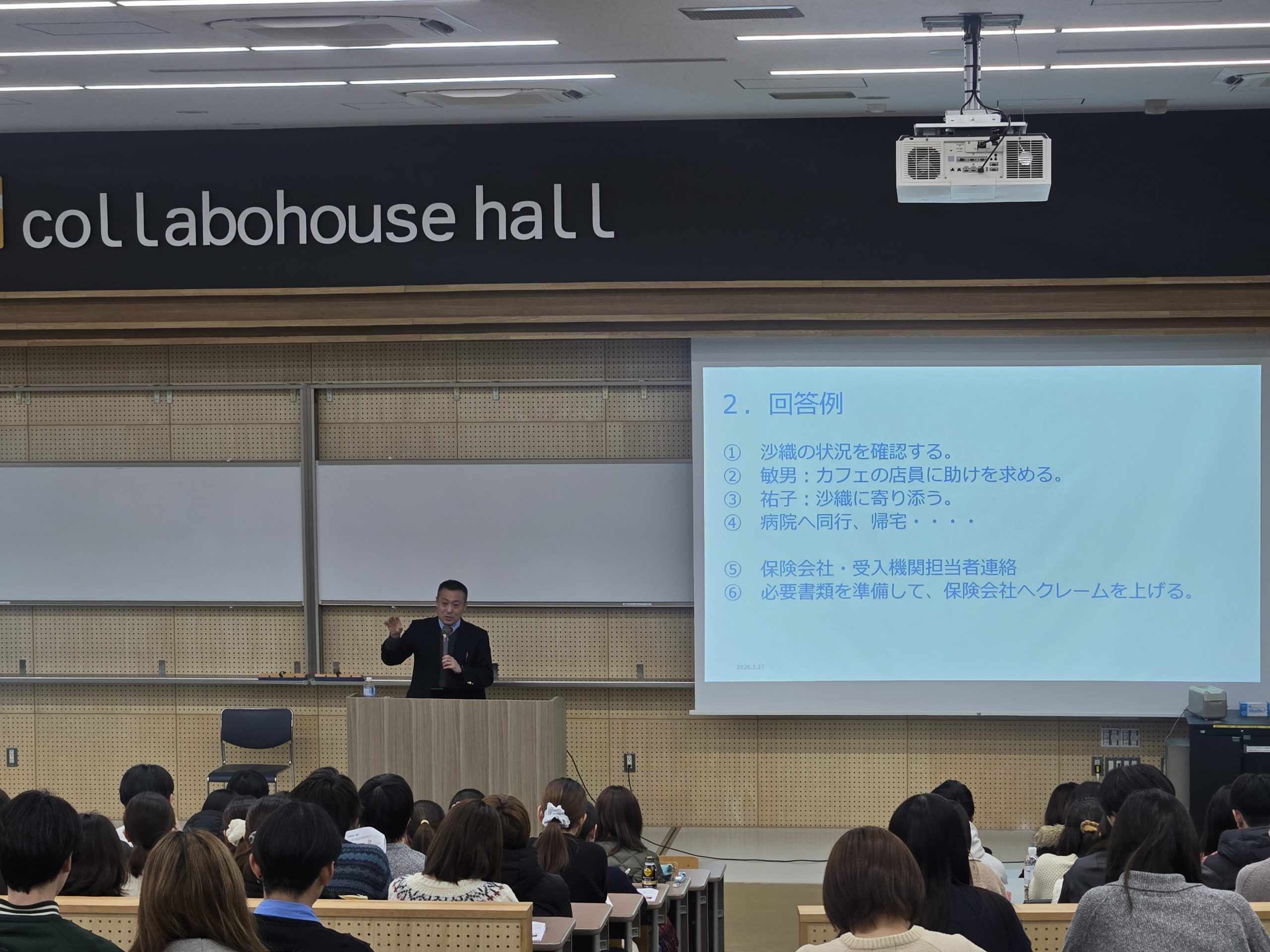 令和8年1月27日(火)、令和7年度海外留学・語学研修に関わる危機管理セミナーをコラボハウスホールで開催し、留学・研修等で海外に渡航予定の本学、松山大学、愛媛県立医療技術大学、人間環境大学、聖カタリナ大学の学生・教職員等あわせて131人が参加しました。