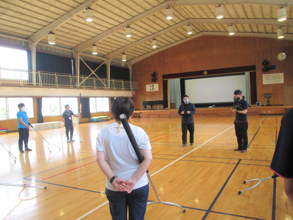 訓練後、児童たちは、桐山真美副校長による訓練の講評及び松山東警察署員による指導助言・講話を聴講しました。また、今年度新たに赴任した教職員等を対象に、松山東警察署員による不審者への対応に関する講習(「さすまた」の使い方に関する指導等)も行われました。