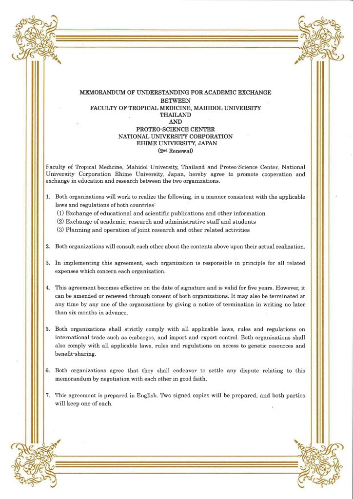プロテオサイエンスセンターのマラリア研究部門および寄生病原体学部門では、実験室内でのマラリア研究を流行地にフィードバックしつつ、有機的に共同研究を発展させてきました。タイ王国におけるマラリアの戦略的国際共同研究を一層発展させるため、平成26年2月、マヒドン大学熱帯医学部と学術交流協定を締結し、平成31年2月に1回目の更新を行い、今回2回目の更新を行いました。