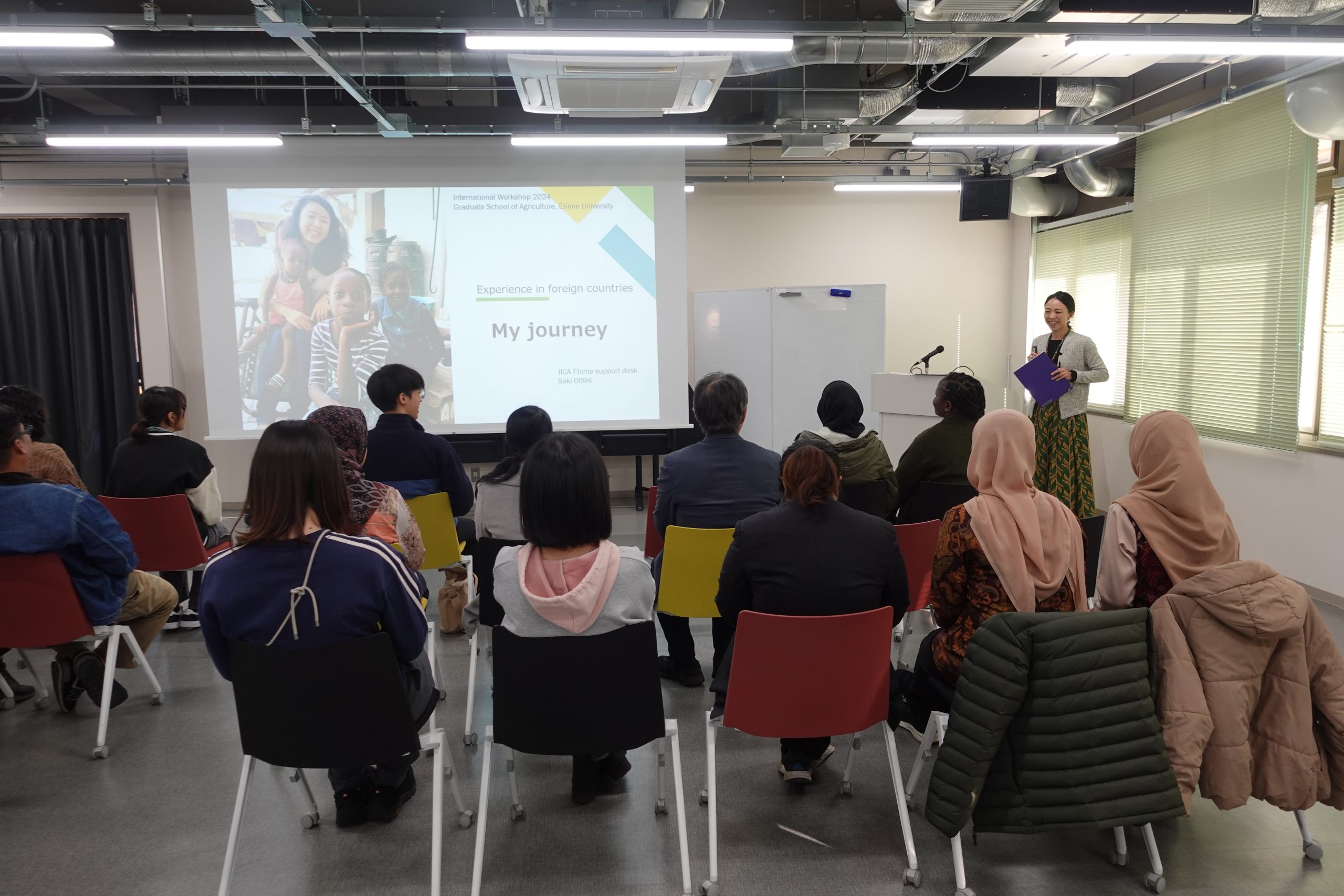 はじめに、三浦猛国際交流委員長による開会の挨拶があり、続いて、独立行政法人国際協力機構(JICA)四国センター愛媛県国際協力推進員の大石紗己さんが、「国際交流」をテーマに、海外協力隊としての活動経験などについて講話を行いました。