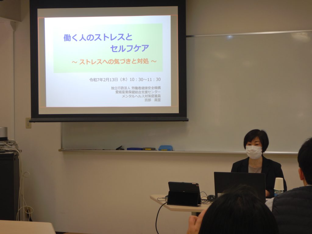 令和7年2月13日(木)、愛大ミューズアクティブ・ラーニングスペース2を主会場として、安全衛生講演会(メンタルヘルス対策セルフケア研修)を対面及びオンラインのハイブリッド形式で開催し、教職員30人が参加しました。