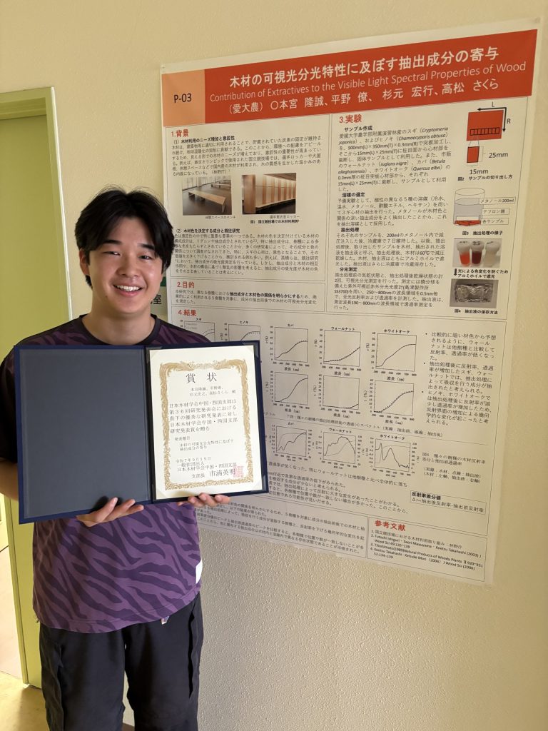 令和7年9月18日(木)、9月19日(金)に、愛媛大学樽味キャンパスで開催された「日本木材学会中国・四国支部第36回研究発表会」において、農学部生物環境学科森林資源学コース4年生の本宮隆誠さん(森林資源利用システム研究室)、農学部卒業生の平野僚さん、農学研究科の杉元宏行准教授、高松さくら特定研究員が、「木材の可視光分光特性に及ぼす抽出成分の寄与」についてポスター発表し、優れた発表であることが認められ、「日本木材学会中国・四国支部研究発表賞」を受賞しました。