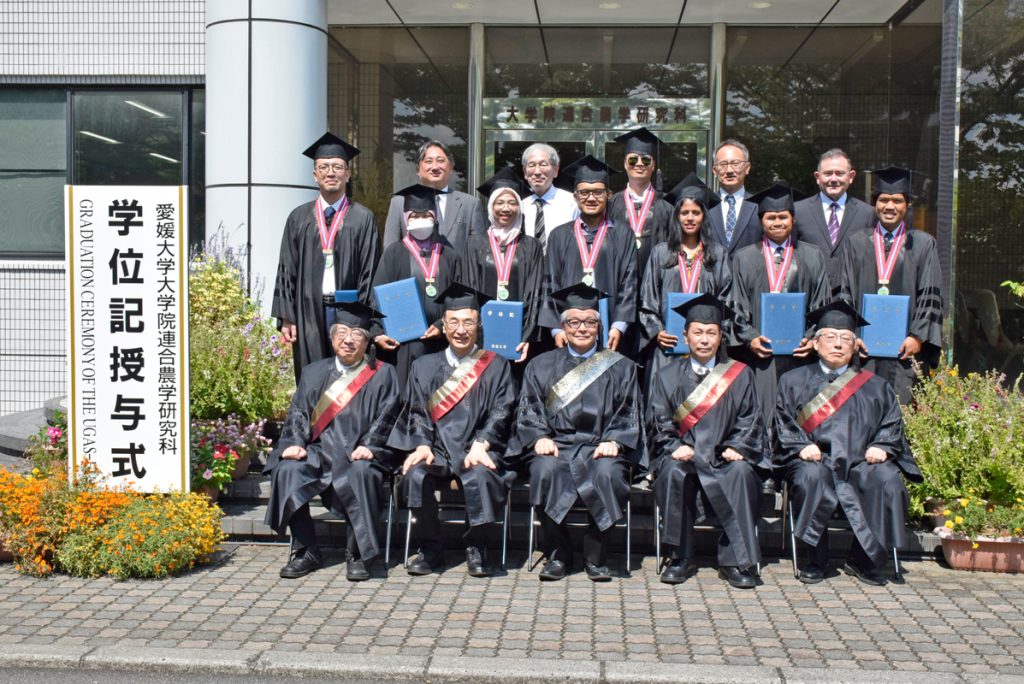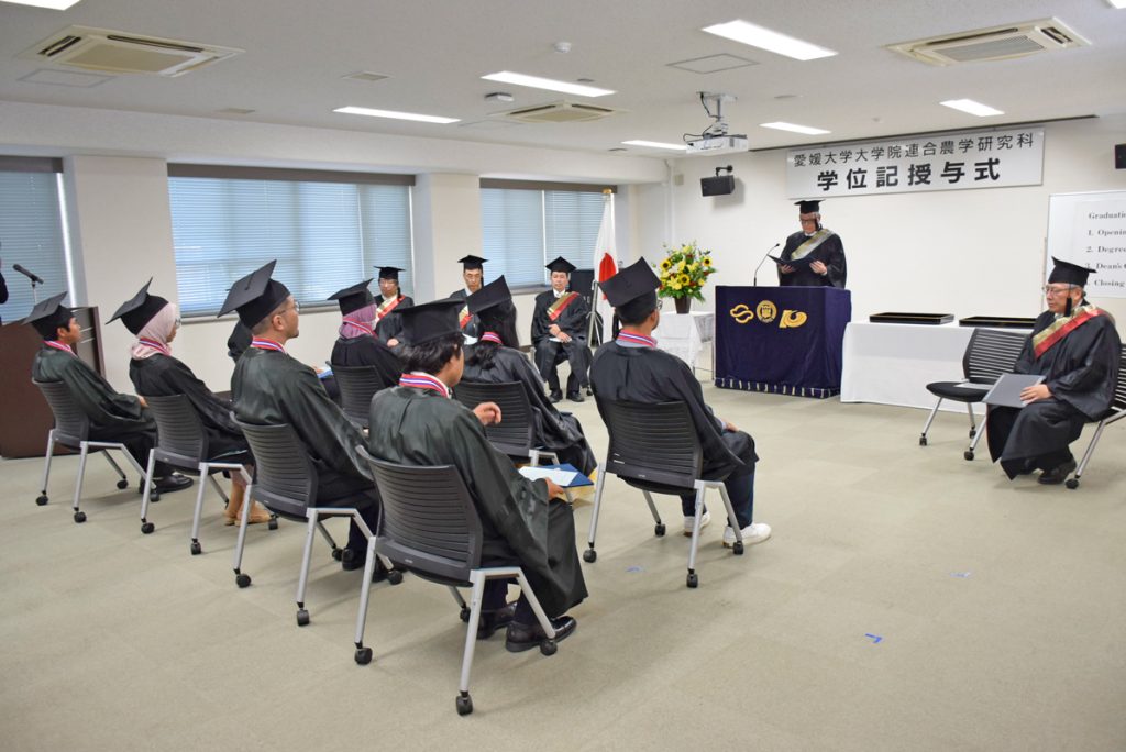 令和7年9月16日(火)、愛媛大学農学部大会議室において、愛媛大学、香川大学及び高知大学の研究科長、専攻長をはじめとした関係者出席のもと、令和7年度愛媛大学大学院連合農学研究科学位記授与式を挙行しました。