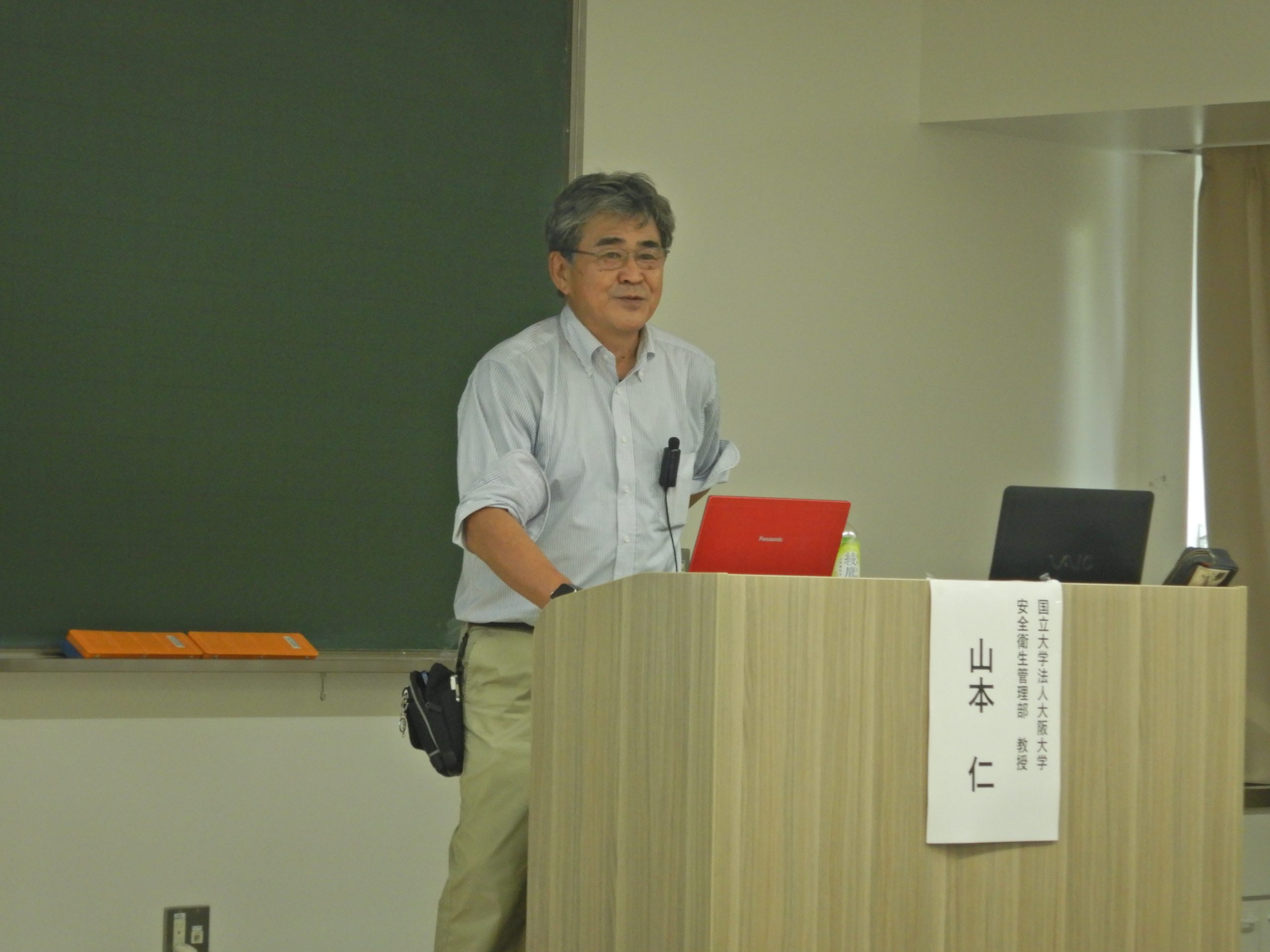 第1部は、国立大学法人大阪大学安全衛生管理部の山本仁教授が登壇し、「研究・実験施設の安全衛生管理―化学物質の自律的管理へ向けてー」と題して講演を行いました。2022年2月に改正されたリスクアセスメントに基づく自律的化学物質管理について触れ、リスクを正しく怖がること、さらには研究のリスクに対し、プロフェッショナルとしての強い意識を持つことが重要であると述べられました。