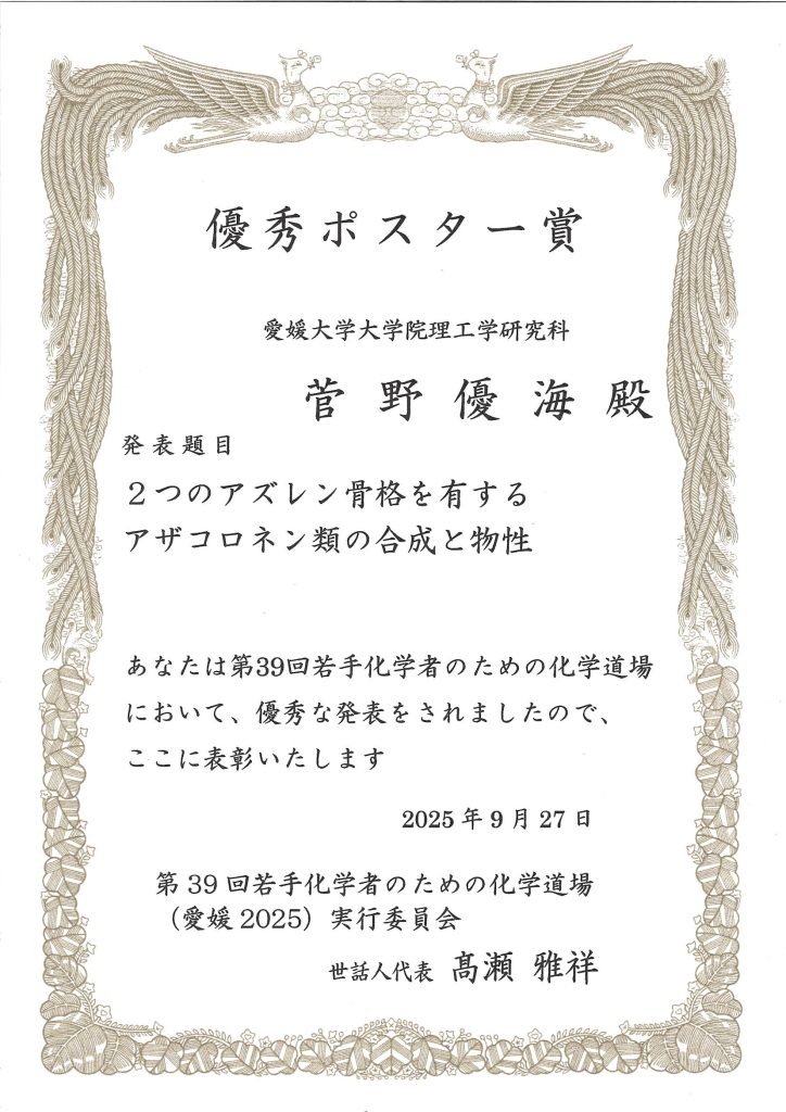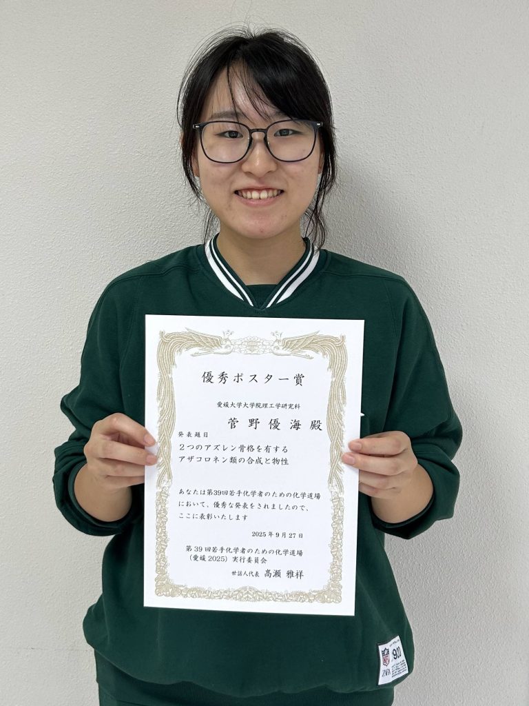 令和7年9月26日(金)~27日(土)、にぎたつ会館で開催された「第39回若手化学者のための化学道場」において、大学院理工学研究科博士前期課程2年生の菅野優海さん(有機化学研究室に所属)が「優秀ポスター賞」を受賞しました。