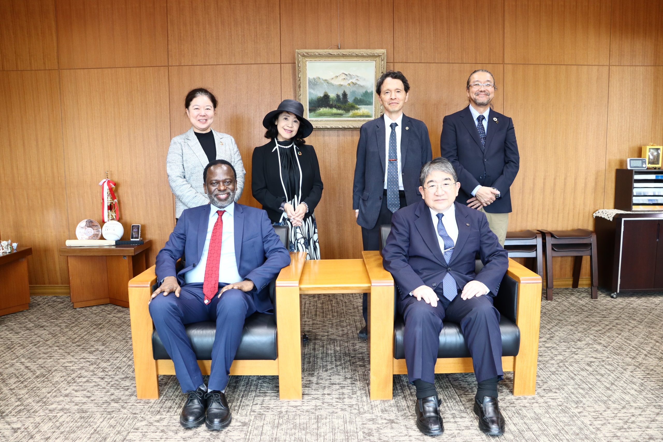 表敬訪問では、国連大学サステイナビリティ高等研究所(UNU-IAS)の山口しのぶ所長、同研究所大学院プログラム事務局の堀尾多香事務局長も同行され、一行は愛媛大学の仁科学長、国際連携推進機構の光信一宏理事・副学長、小林修学長特別補佐の歓迎を受けました。